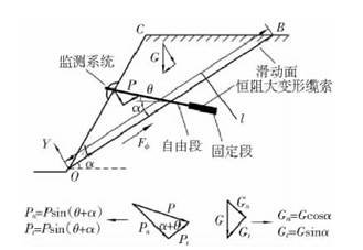 下滑力監(jiān)測方法為通過恒阻大變形纜索穿過滑動面,對邊坡巖體施加一個預(yù)應(yīng)力 p。通過可以直接測出的擾動力 p,可以推導(dǎo)擾動力和滑動力之間的函數(shù)關(guān)系,*終得到滑動力的變化量 addin ne.ref.{ce1bd0ee-846a-4eb8-8fcf-f644930163e4}[3]。邊坡滑動力監(jiān)測力學(xué)模型見圖1。由力的平衡原理,推導(dǎo)邊坡滑動力為